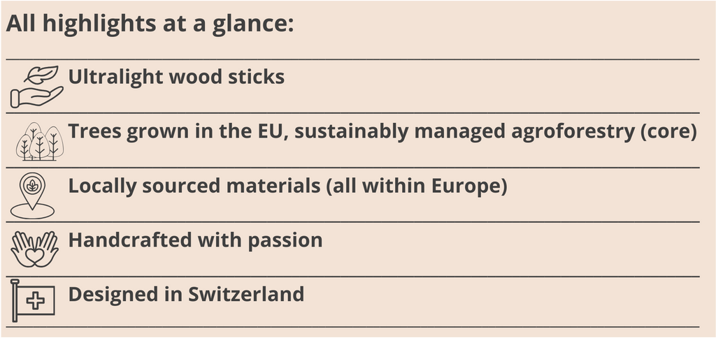 For our sticks, we exclusively use wood from trees planted in the EU. For our ultra-light wooden core, we use wood from sustainably managed plantations (Spain).